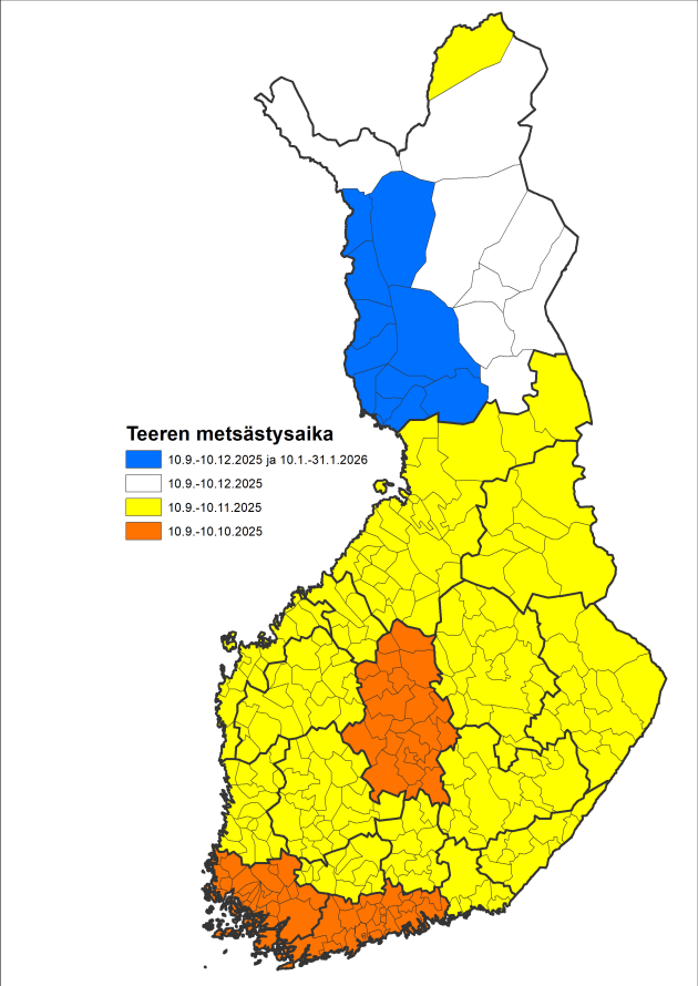 HUOM! Tammikuinen talvimetsästys (sinisellä merkitty alue) koskee vain urosteertä.