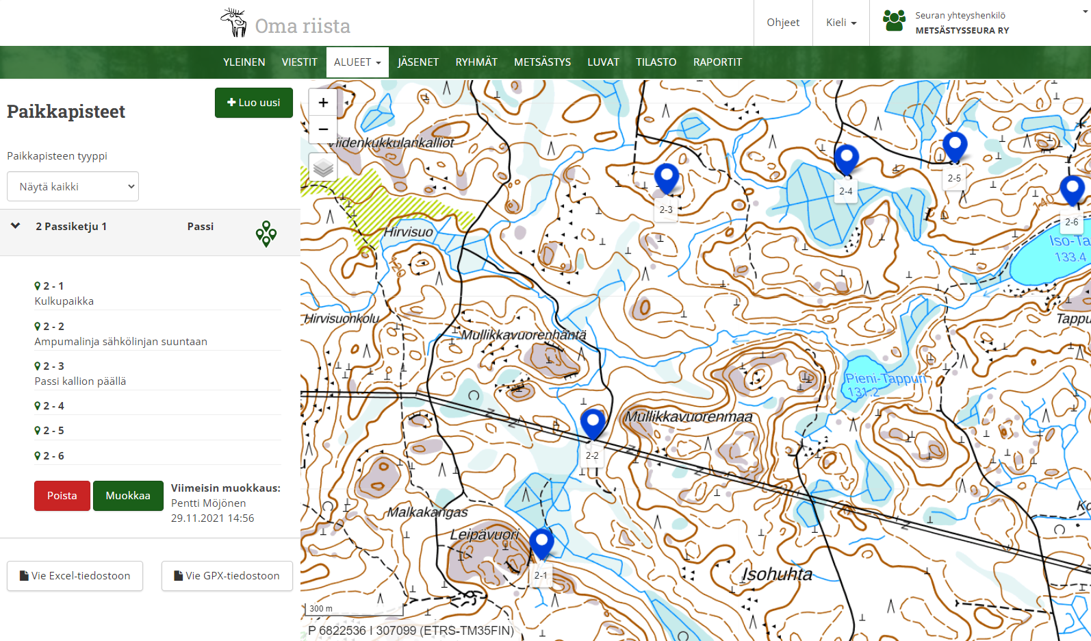 Seuran yhteyshenkilö ylläpitää paikkapisteitä Oma riista -verkkopalvelussa. Kaikki seuran jäsenet voivat tarkastella paikkapisteitä verkkopalvelusta tai Oma riista -mobiilisovelluksesta valitsemalla alueen, johon paikkapisteet on liitetty. Mobiilisovelluksessa paikkapisteet ovat aluksi tarjolla vain Android-puhelimiin (sovellusversio 2.5.2.). iOS -laitteille toiminnallisuus on saatavilla vasta ensi vuoden puolella.
