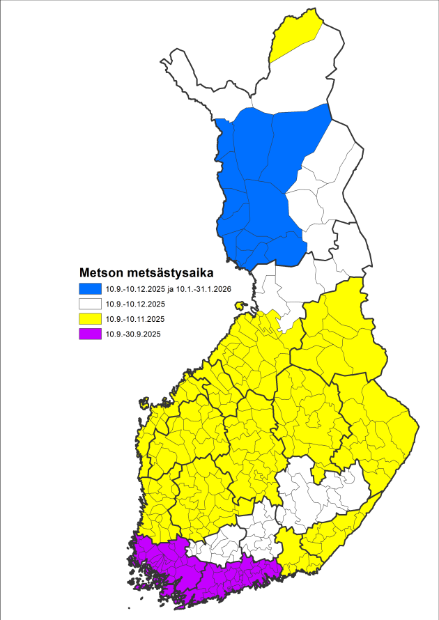 HUOM! Tammikuinen talvimetsästys (sinisellä merkitty alue) koskee vain urosmetsoa.