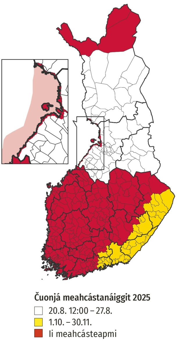 | Kainuu eanagottis, Lappi eanagottis válddekeahttá vuhtii Eanodaga, Anára ja Ohcejoga gielddaid ja váldogeainnu E8 mearabeale guovlluid Durdnosa, Giemaeatnama, Giema ja Simo gielddain, Davvebađaeatnama eanagottis válddekeahttá vuhtii váldogeainnu E8 mearabeale guovlluid, Ii, Kalajoki, Kempele, Liminka, Lumijoki, Oulu, Pyhäjoki, Raahe ja Siikajoki gielddain. Bivdu lobálaš váldogeainnu E8 ja guovllugeainnu 813 gaskkas lean guovllus. |