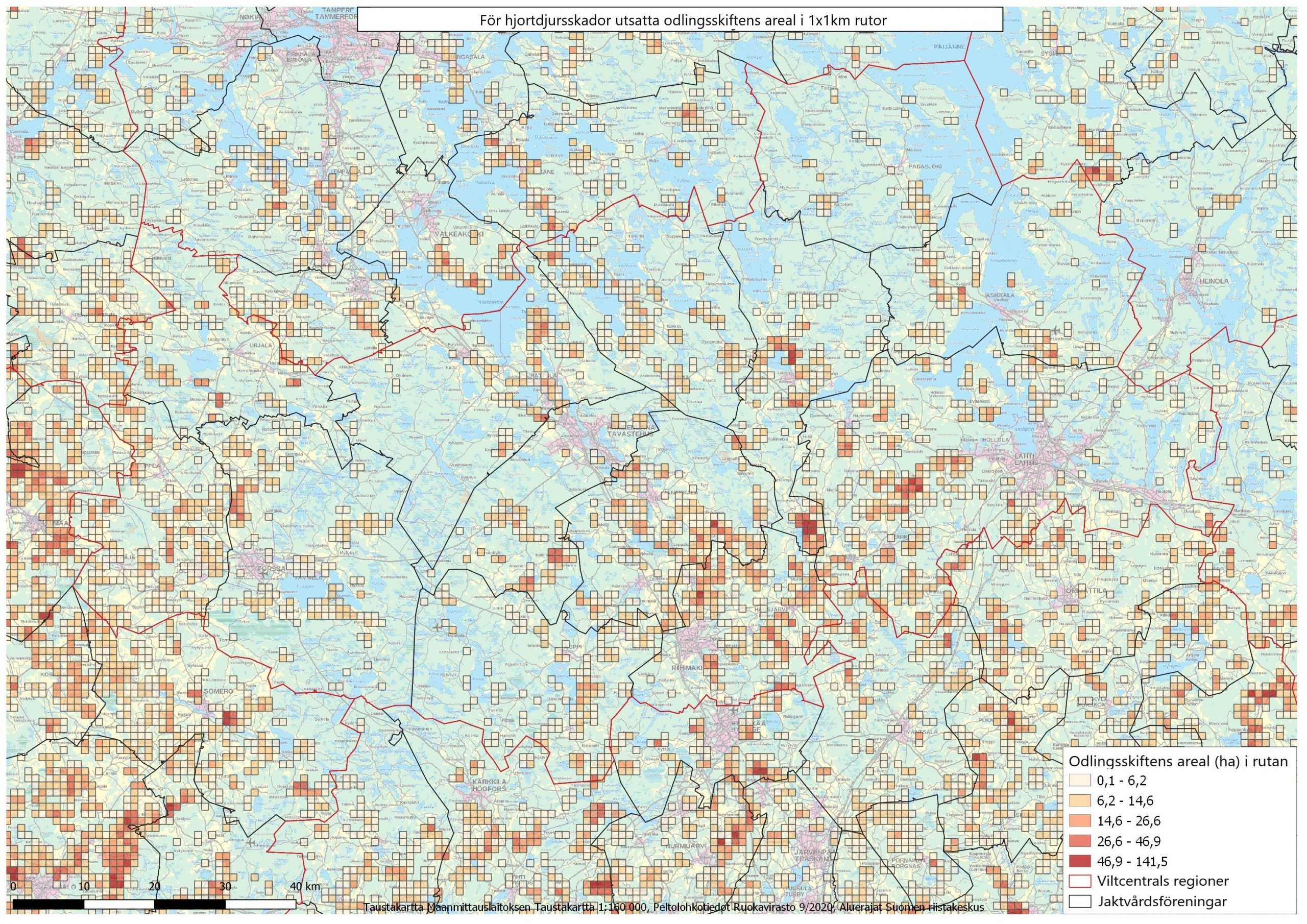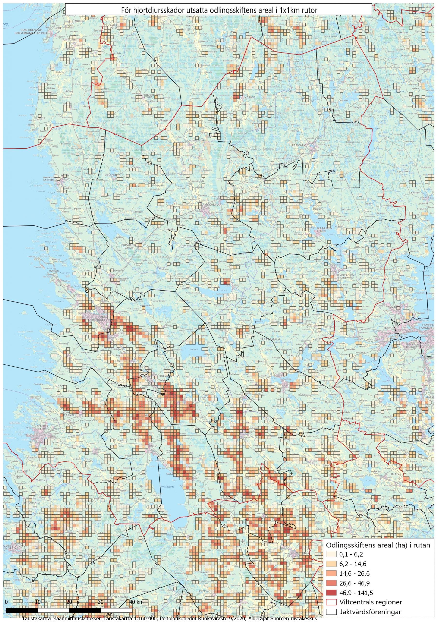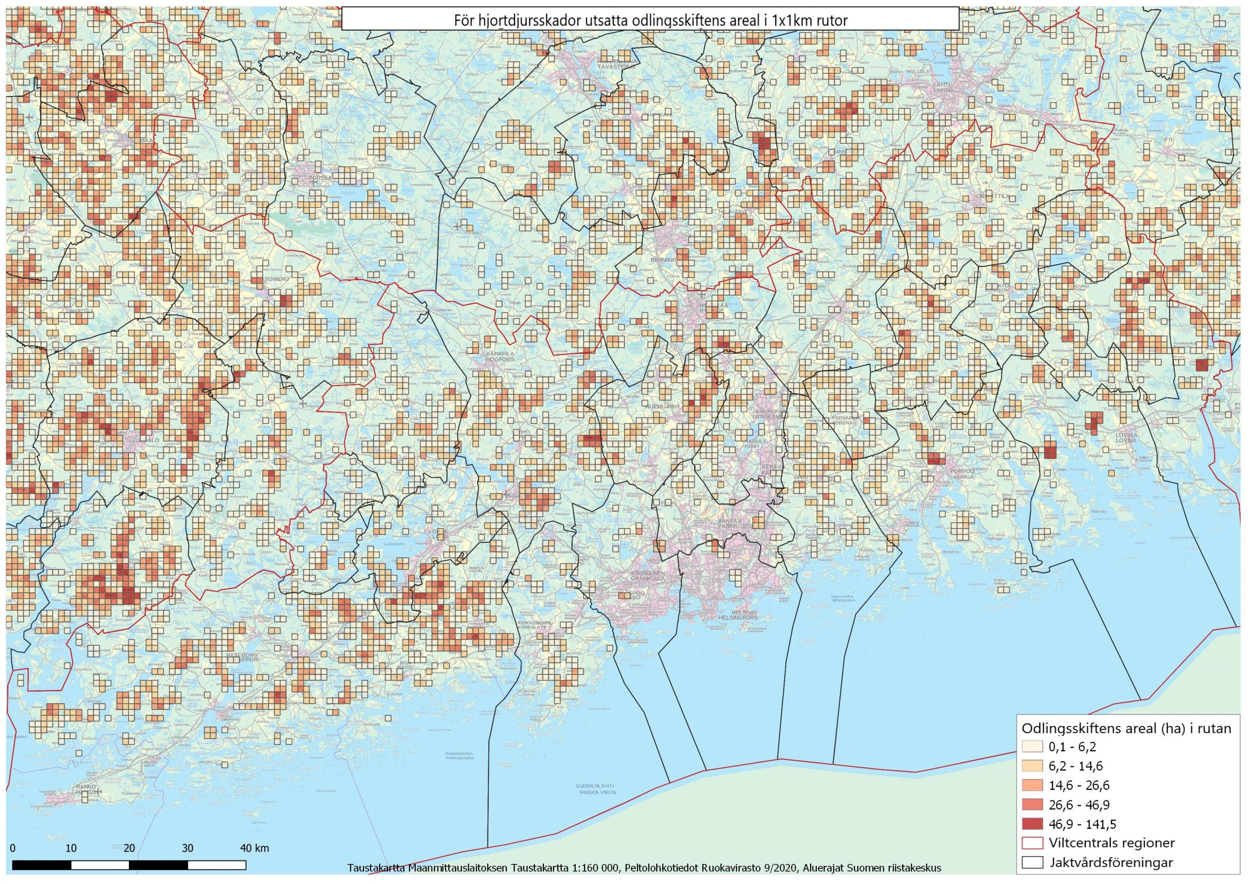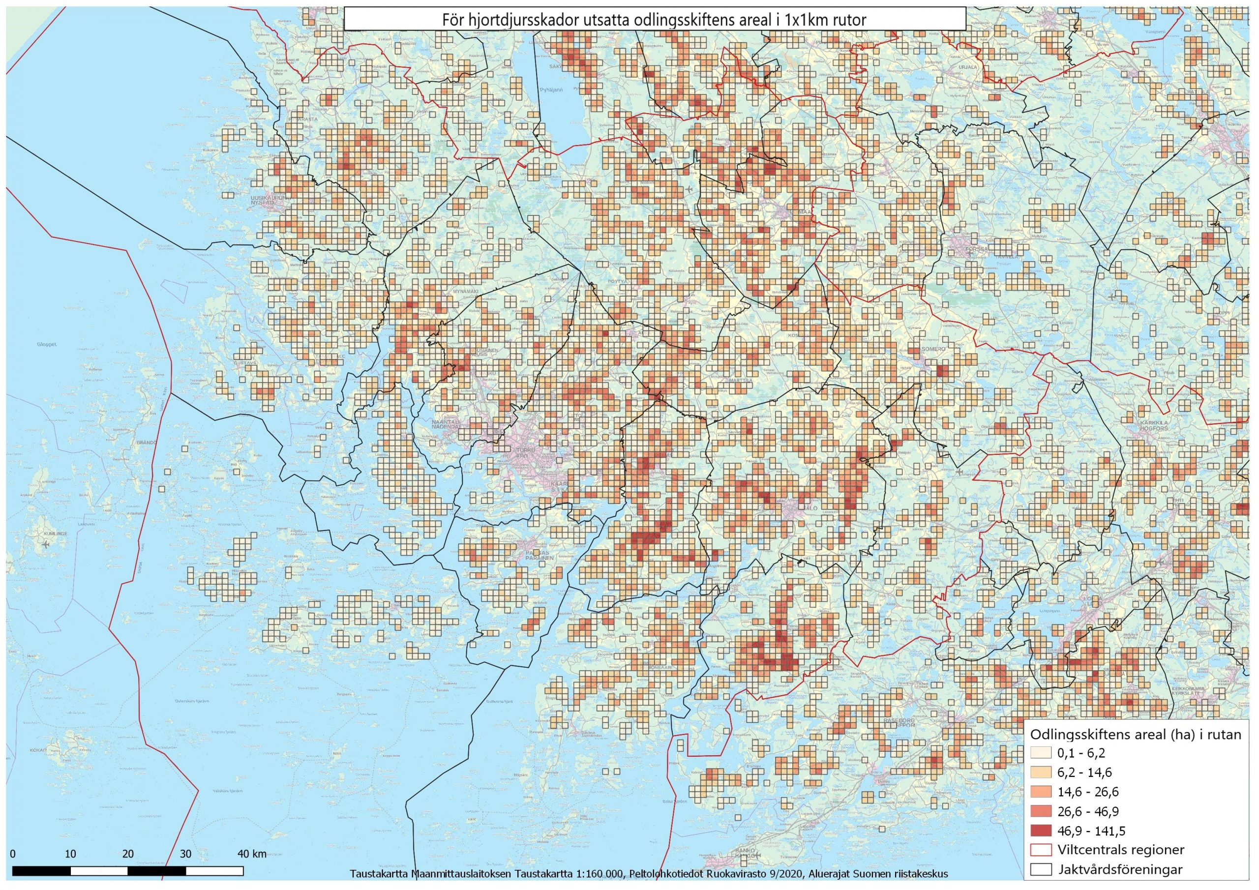 På kartorna Riskåkrar har de totala arealerna beräknats enligt 1 x 1 km rutor för odlingsskiften som är utsatta för hjortdjursskador. Till växtarterna hör alla rotfrukter, bär och grönsaker samt höstsäd.