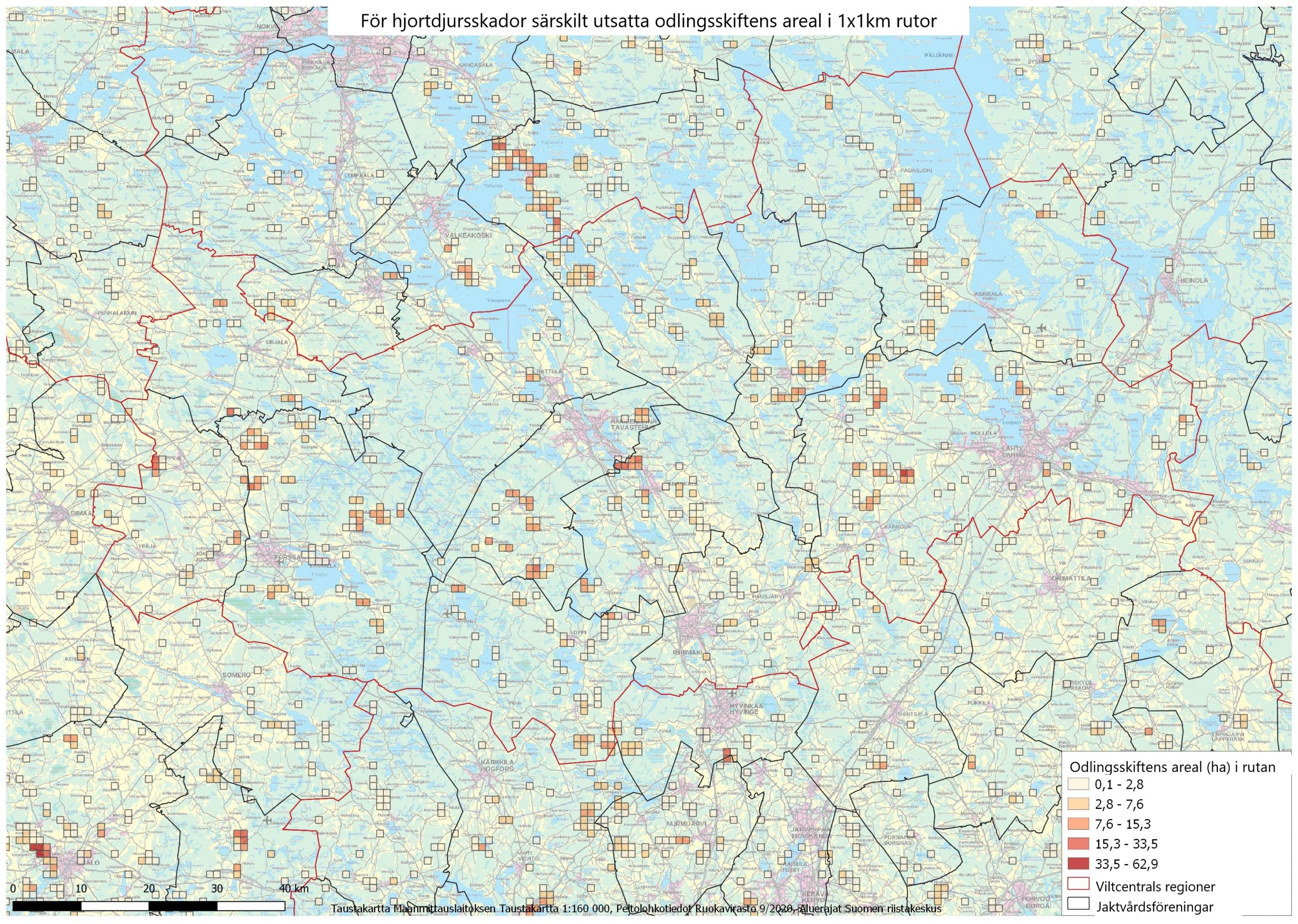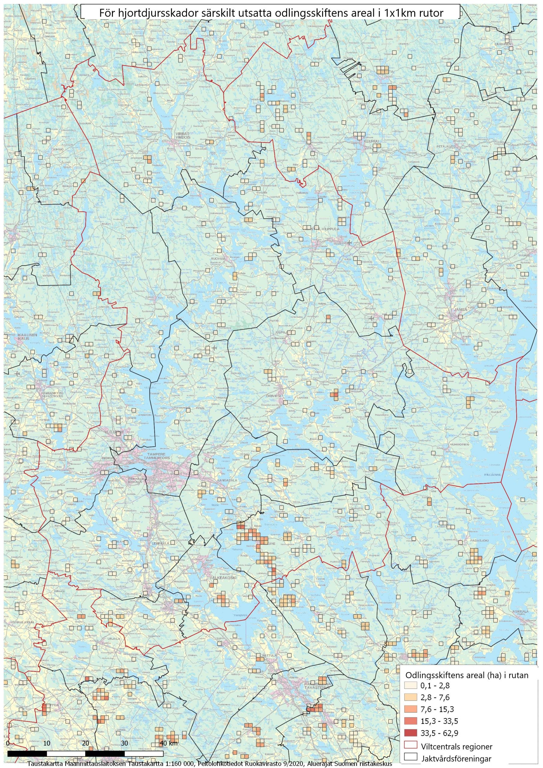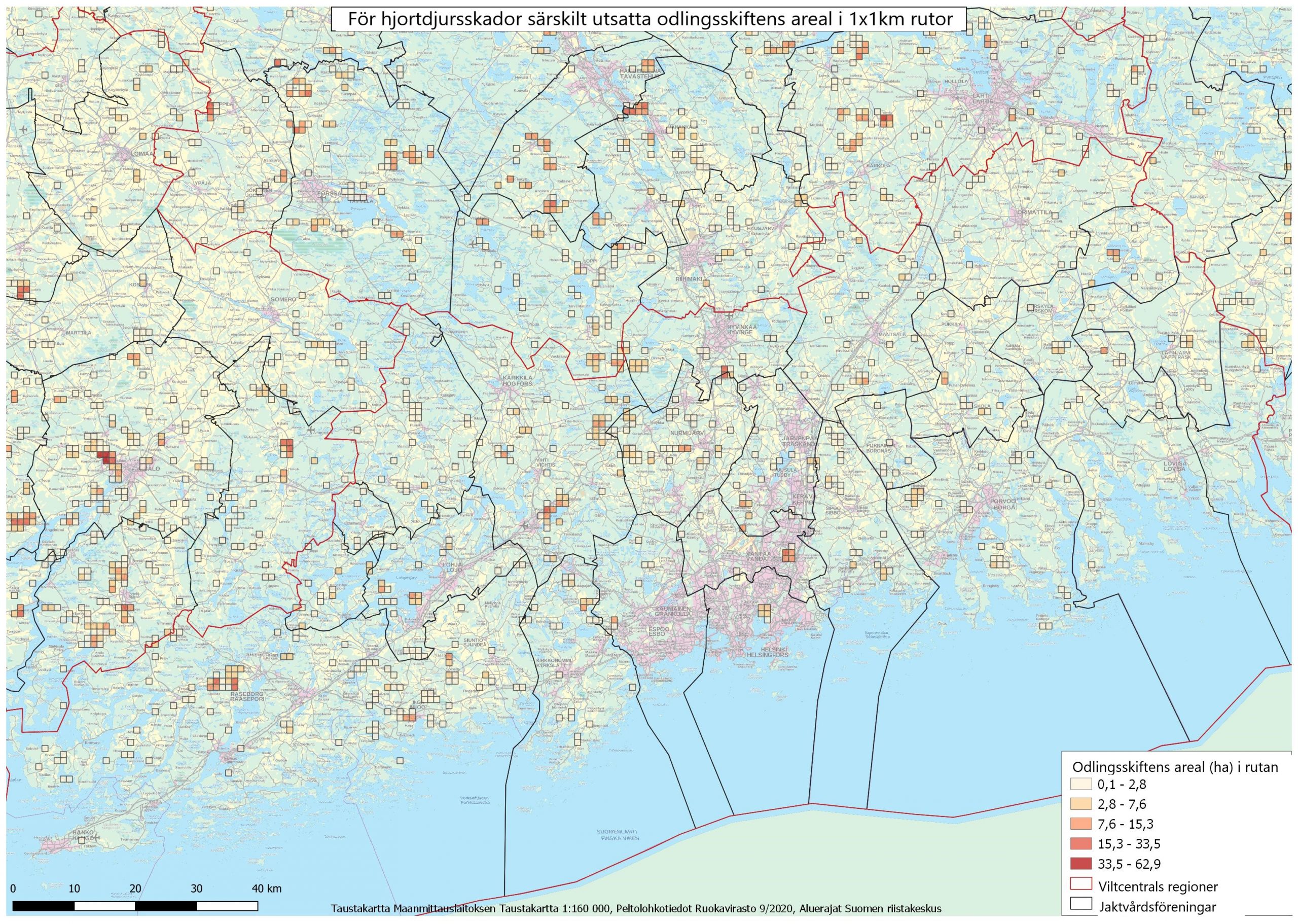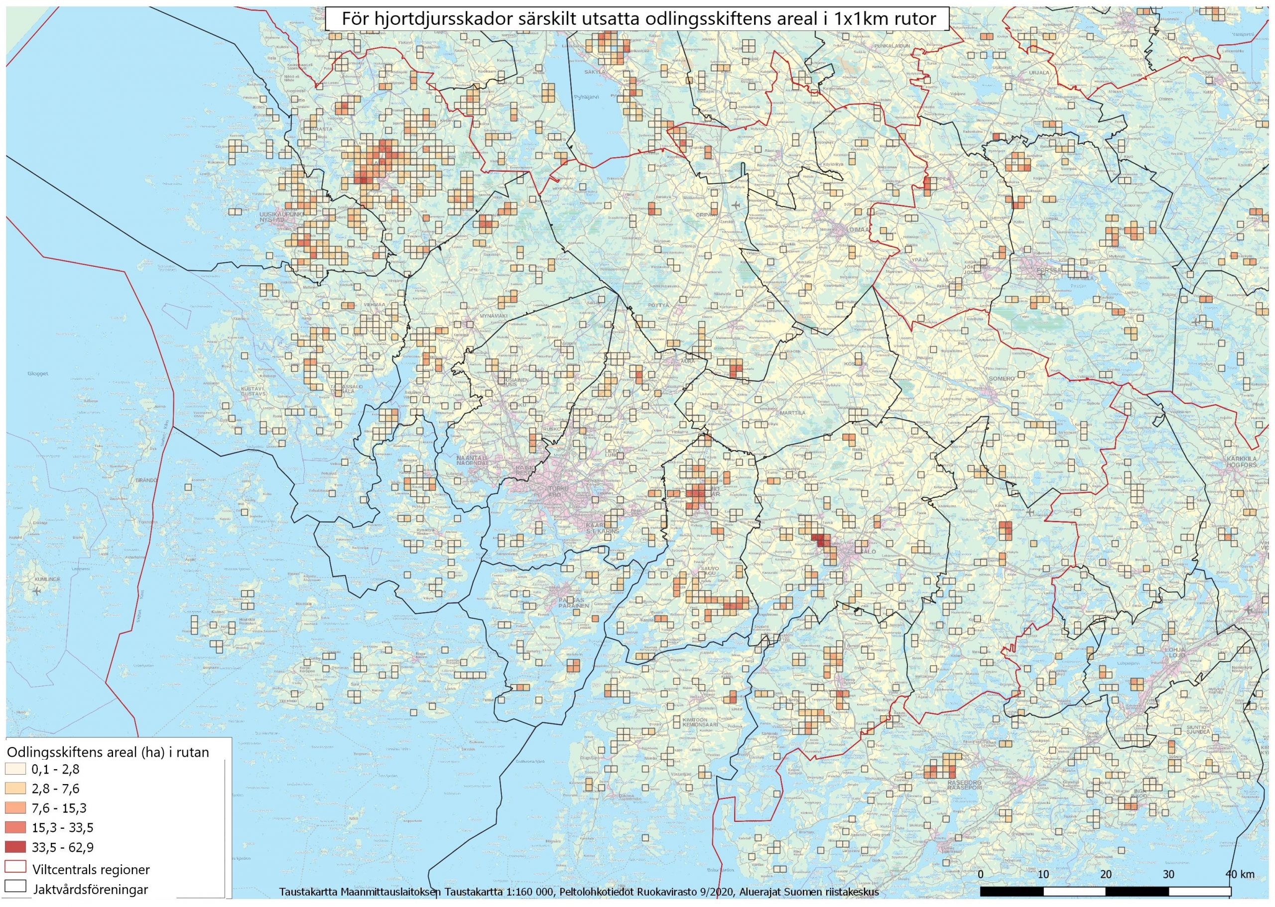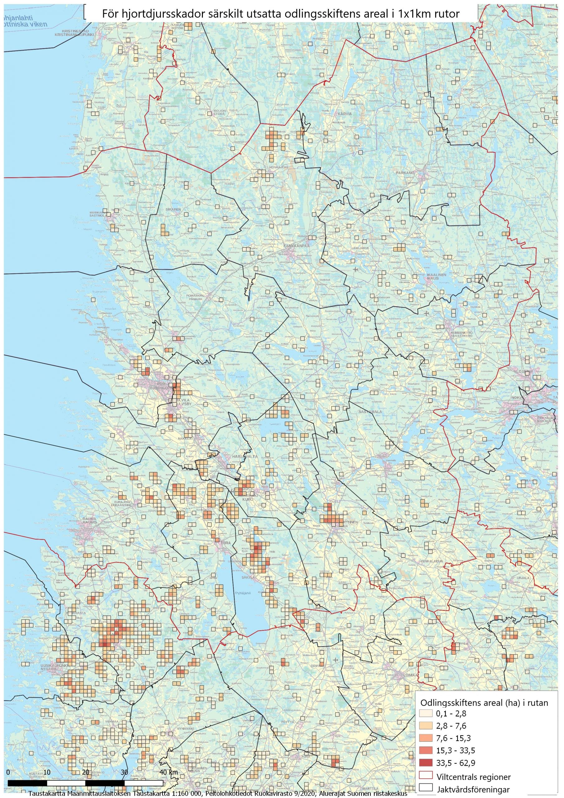 På kartorna Riskåkrar har de totala arealerna beräknats enligt 1 x 1 km rutor för odlingsskiften som är utsatta för hjortdjursskador. Till växtarterna hör alla rotfrukter, bär och grönsaker samt höstsäd.