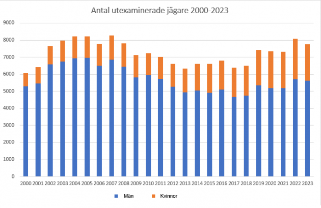 Varje år avlägger 7 000–8 000 personer jägarexamen. Antalet har hållits på en konstant nivå. I fjol var 28 procent av de utexaminerade kvinnor. Många börjar jaga även i vuxen ålder.