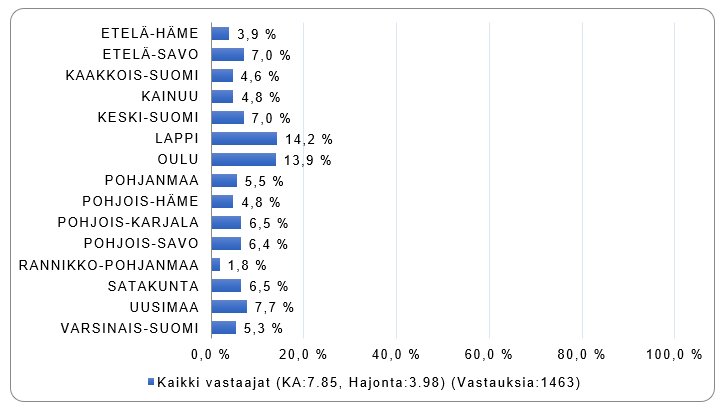 I enkäten frågades därtill, på vilket av viltcentralens områden man mest sannolikt skulle delta i ett utbildningstillfälle. Utgående från de presenterade svaren i bild 2 kan man estimera att det även beskriver fördelningen av mängden besvarare på olika områden.
